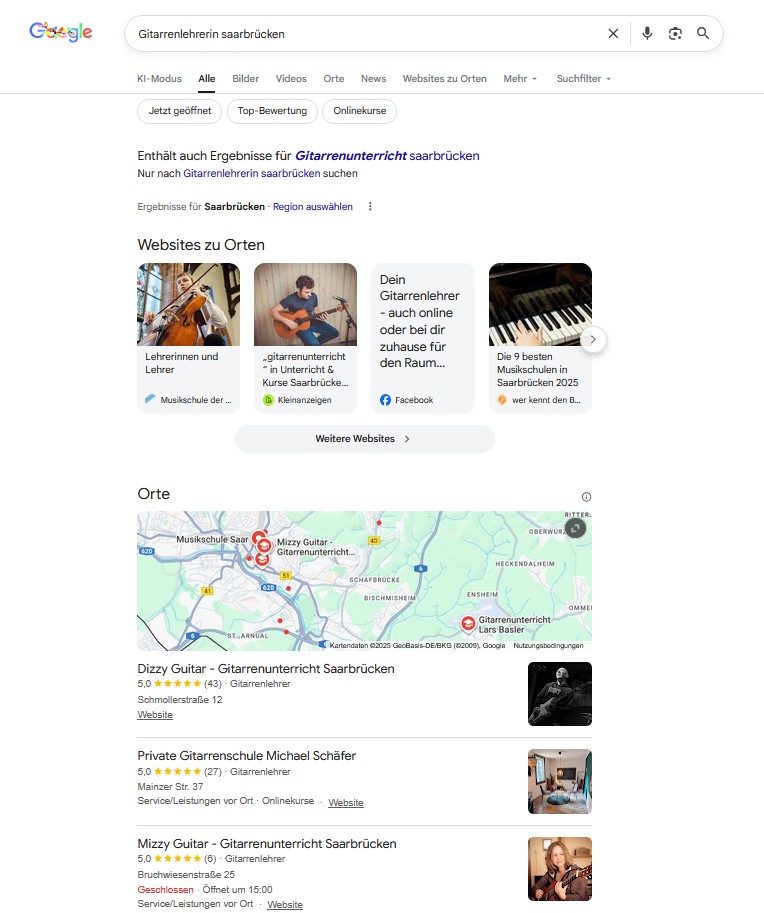 Bei der Suche nach „Gitarrenlehrerin Saarbrücken“ weist Google darauf hin, dass auch Ergebnisse für Gitarrenunterricht Saarbrücken enthalten sind – ein Zeichen dafür, dass die weibliche Form algorithmisch nicht als Hauptbegriff behandelt wird und Google automatisch auf den übergeordneten Suchbegriff zurückgreift.