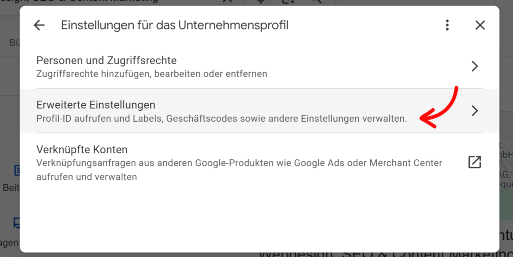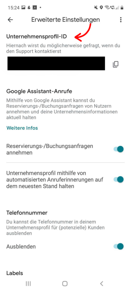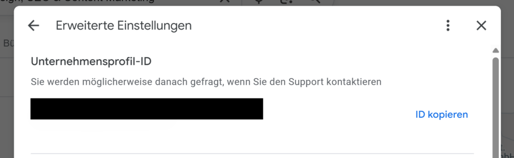 6. Unternehmensprofil-ID anzeigen lassen: In den erweiterten Einstellungen wird Ihnen nun die Unternehmensprofil-ID sichtbar angezeigt. Diese können Sie dort direkt kopieren oder notieren.
