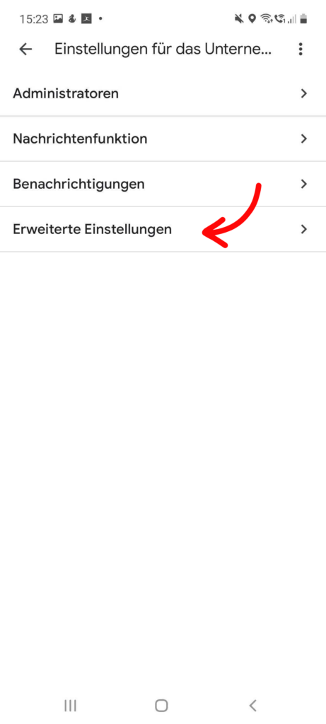 5. Erweiterte Einstellungen öffnen: Tippen Sie im Einstellungsmenü auf „Erweiterte Einstellungen“, um weitere technische und administrative Details zum Unternehmensprofil aufzurufen.