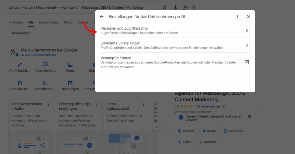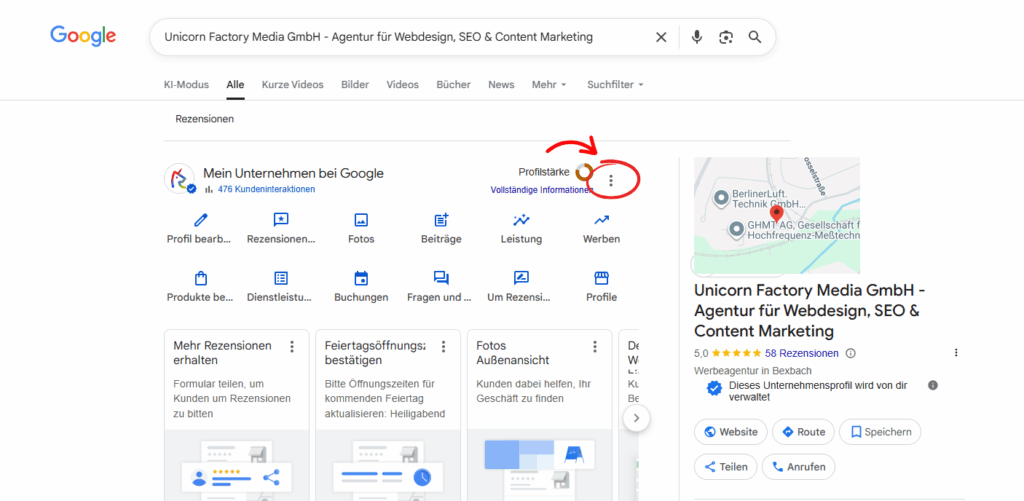 1. Google Unternehmensprofil öffnen: Öffnen Sie Ihr Google Unternehmensprofil in der Suche, während Sie mit dem Konto angemeldet sind, das Zugriff hat. Dafür reicht es, den eigenen Firmennamen in Google einzugeben oder man geht über das Unternehmensprofil-Dashboard.