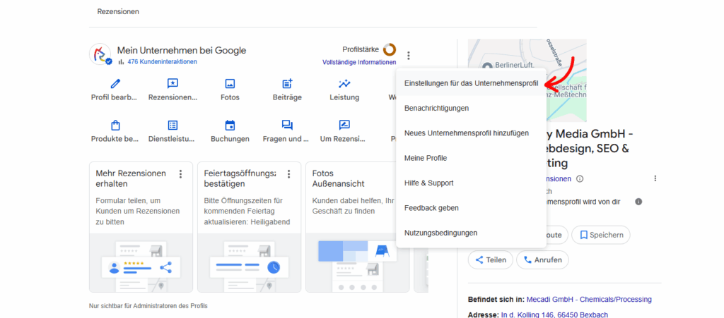 2. Verwaltungsbereich öffnen: Klicken Sie im sichtbaren Profilbereich auf das Drei-Punkte-Menü und wählen Sie “Einstellungen für das Unternehmensprofil” aus.