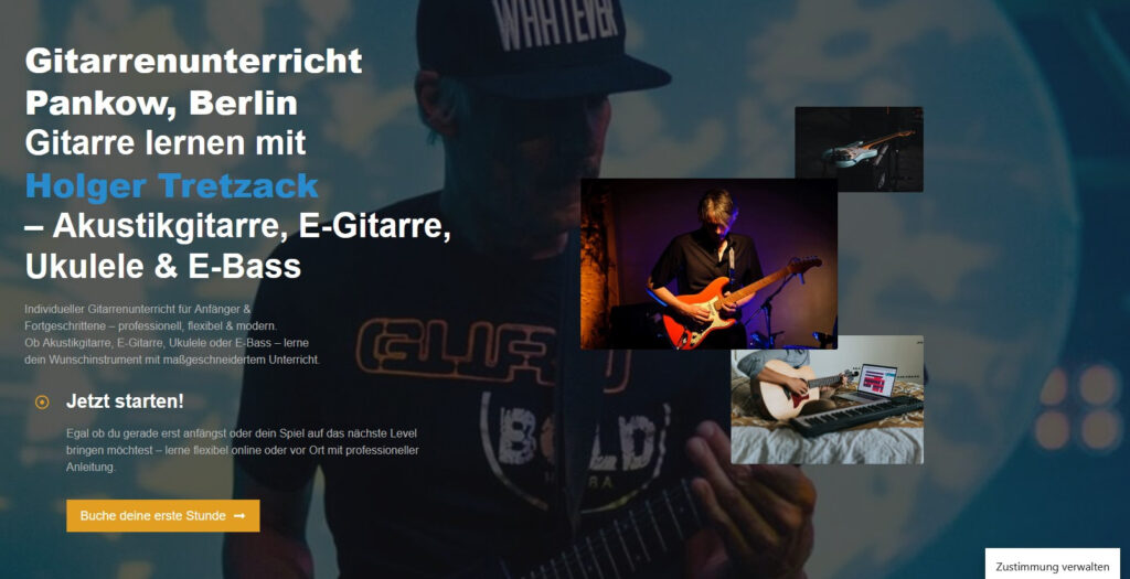 - Persönliche Website mit klarem Fokus: „Gitarrenunterricht Pankow, Berlin – Akustikgitarre, E-Gitarre, Ukulele & E-Bass“.