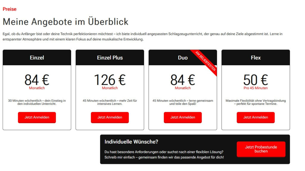 - Übersichtliche Angebotsstruktur: Einzelunterricht, Online-Unterricht, Workshops, Bandcoaching.