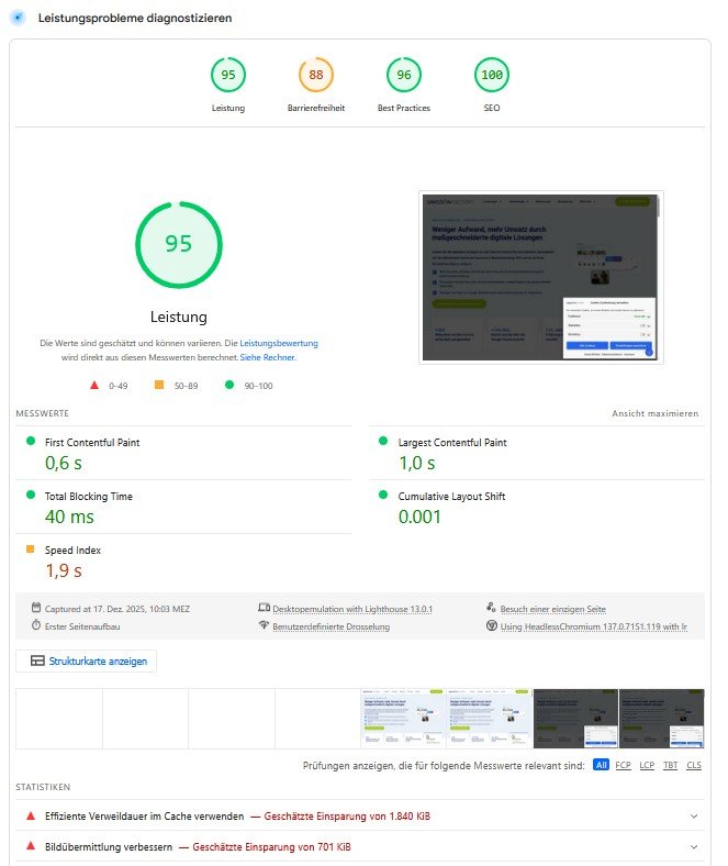 Wichtig ist: Diese Diagnose liefert keine pauschalen Lösungen, sondern technische Hinweise. Nicht jede Warnung muss zwingend behoben werden. Entscheidend ist, die Punkte im Zusammenhang der gesamten Website zu bewerten und gezielt an den Ursachen anzusetzen, die die Nutzererfahrung tatsächlich beeinträchtigen.